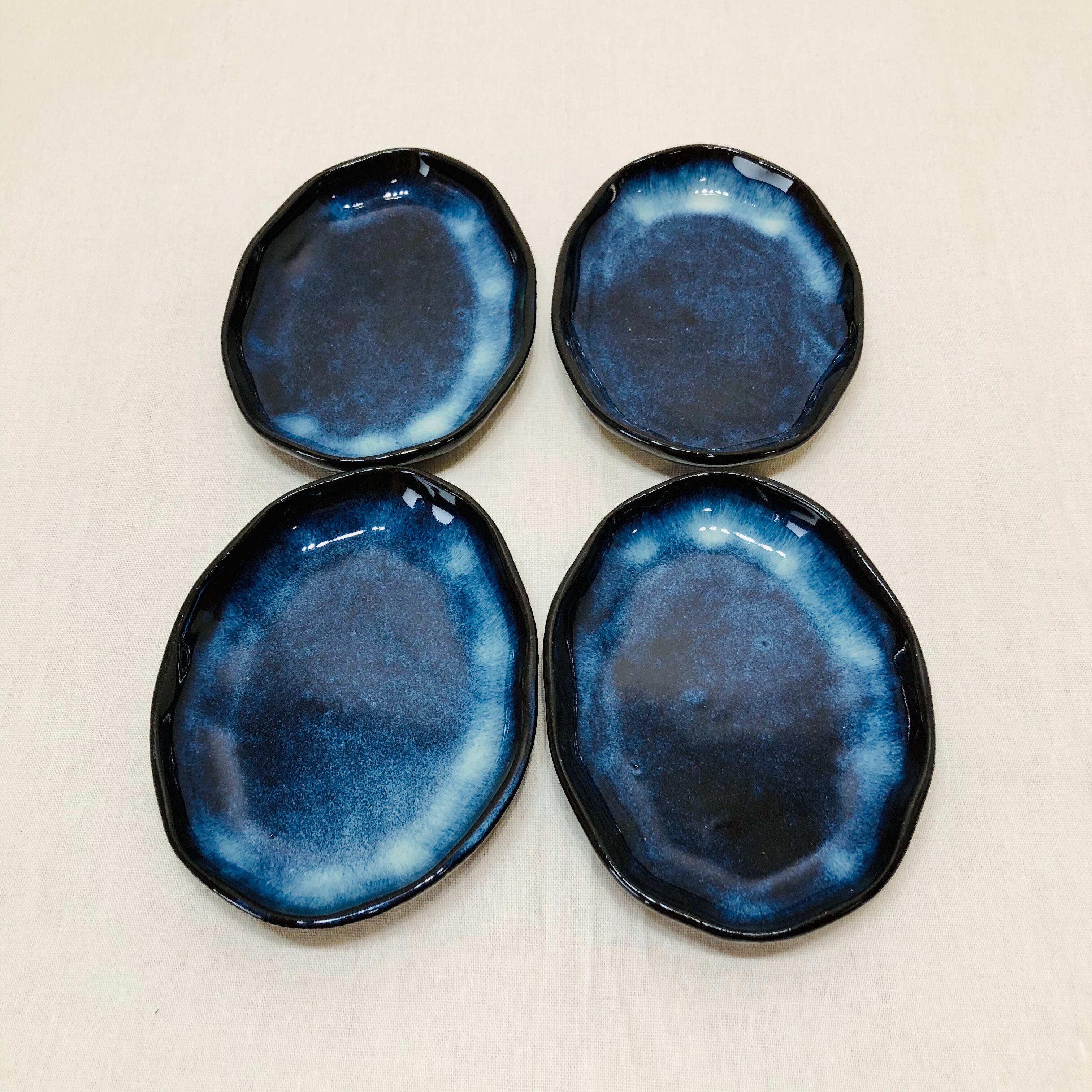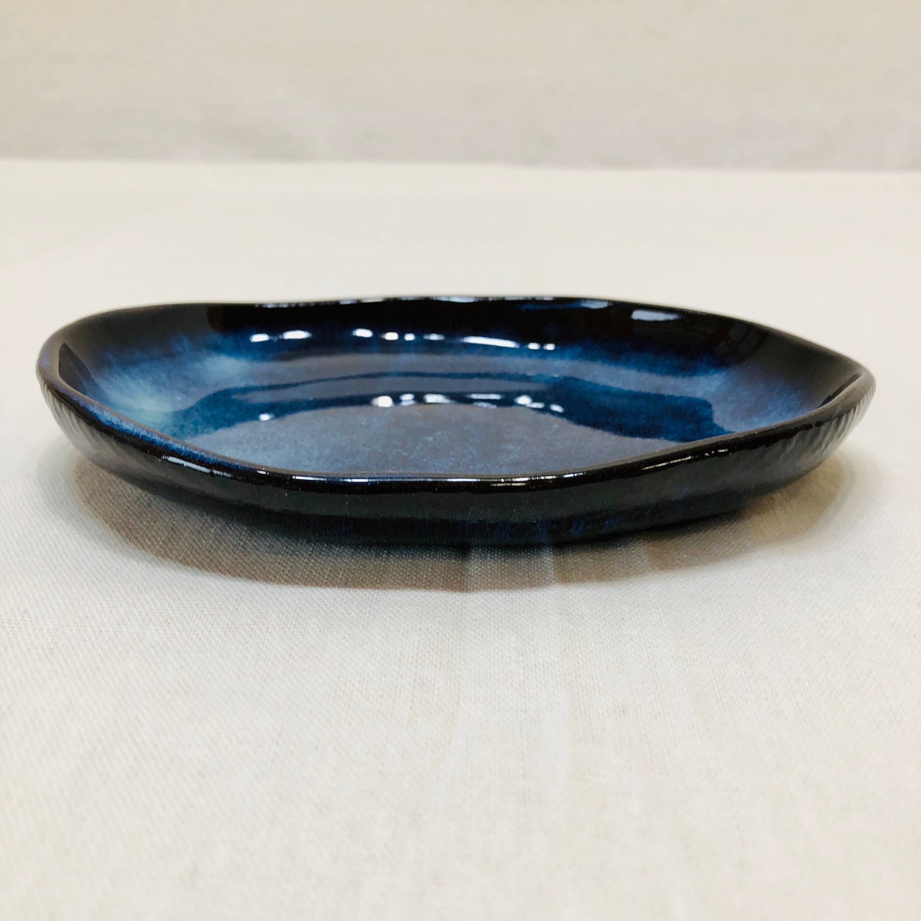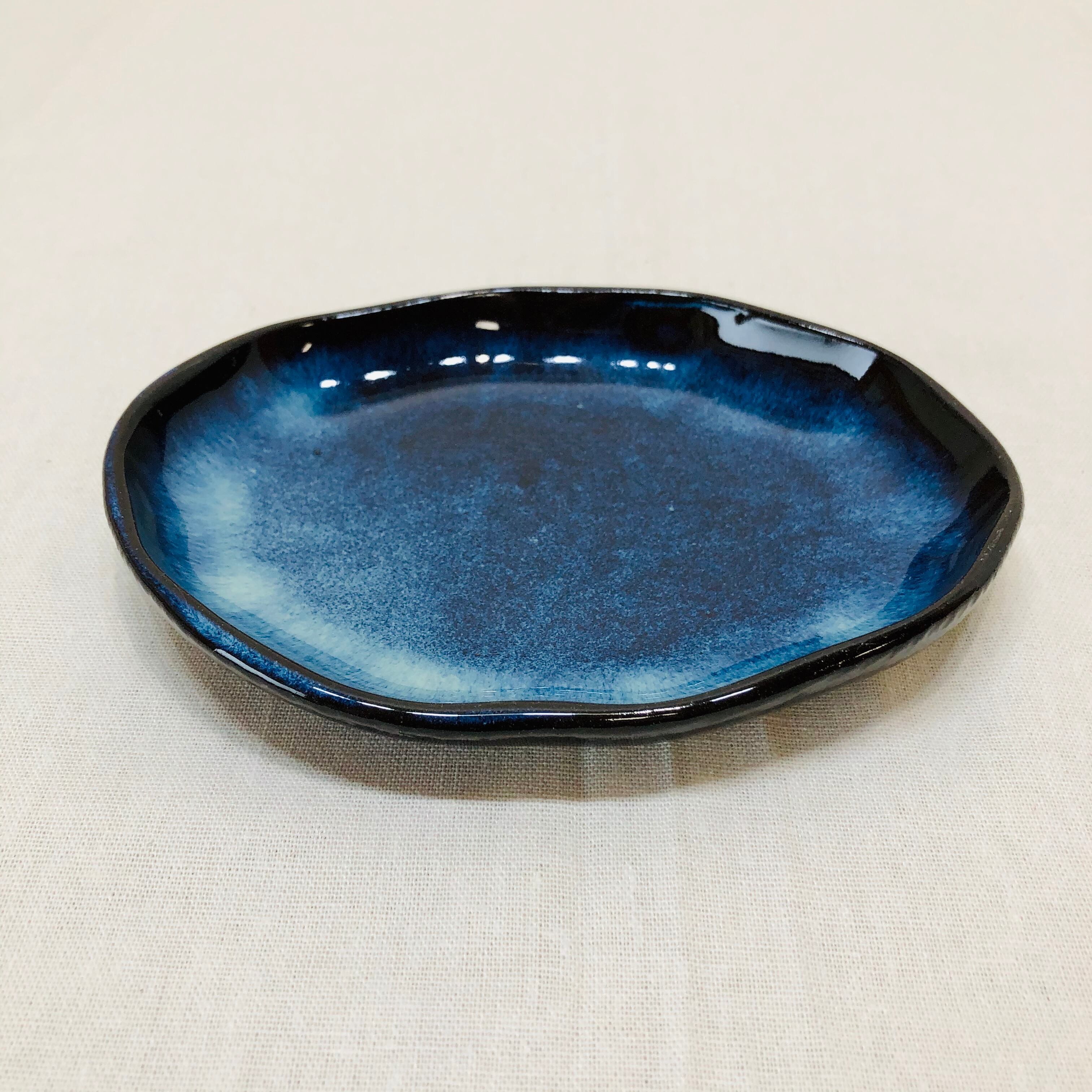 鉄分の多い土で作品を作り、天然の藁灰、木灰を調合した釉薬を使用している為、青く発色した釉薬の流れが不安定で同じ物はできません。