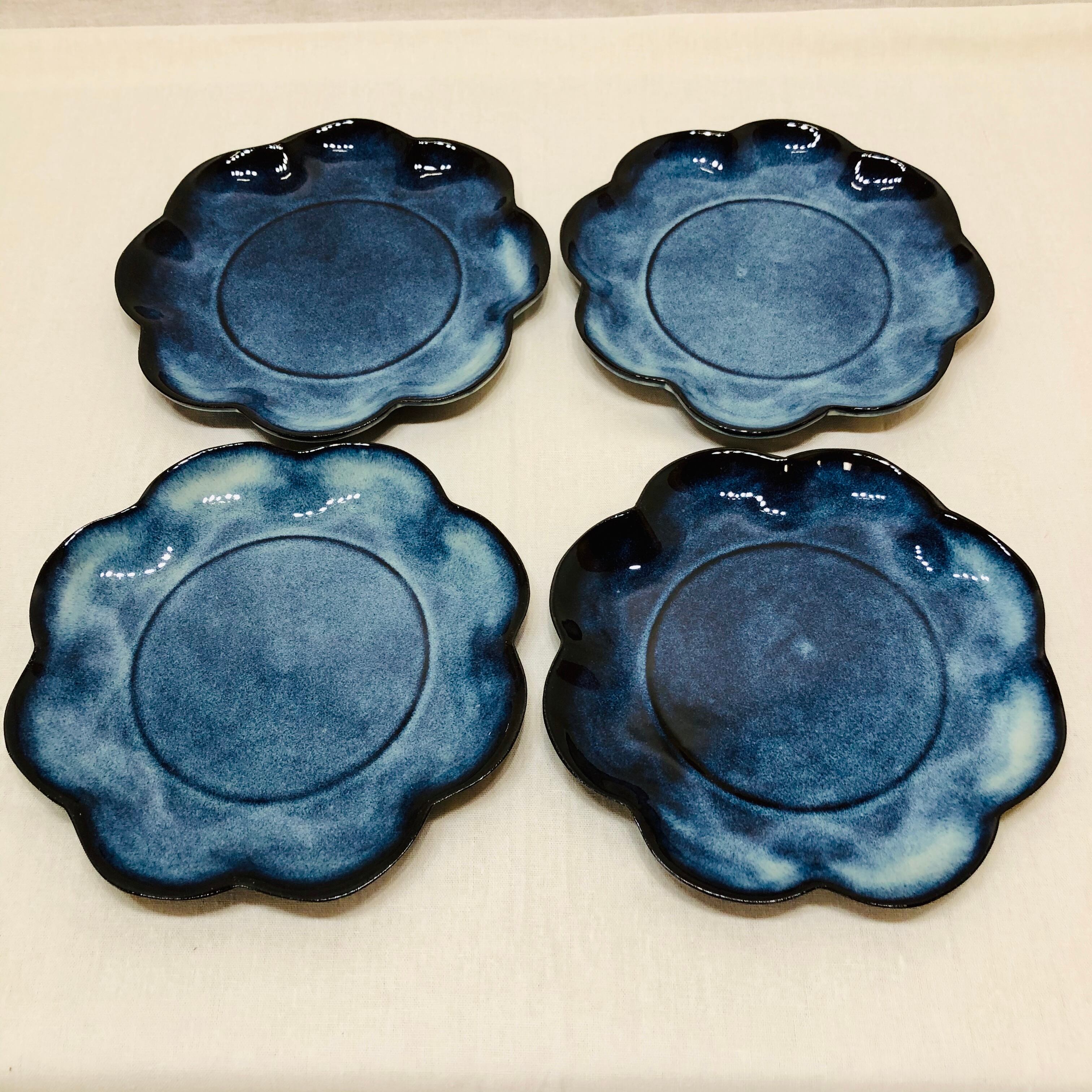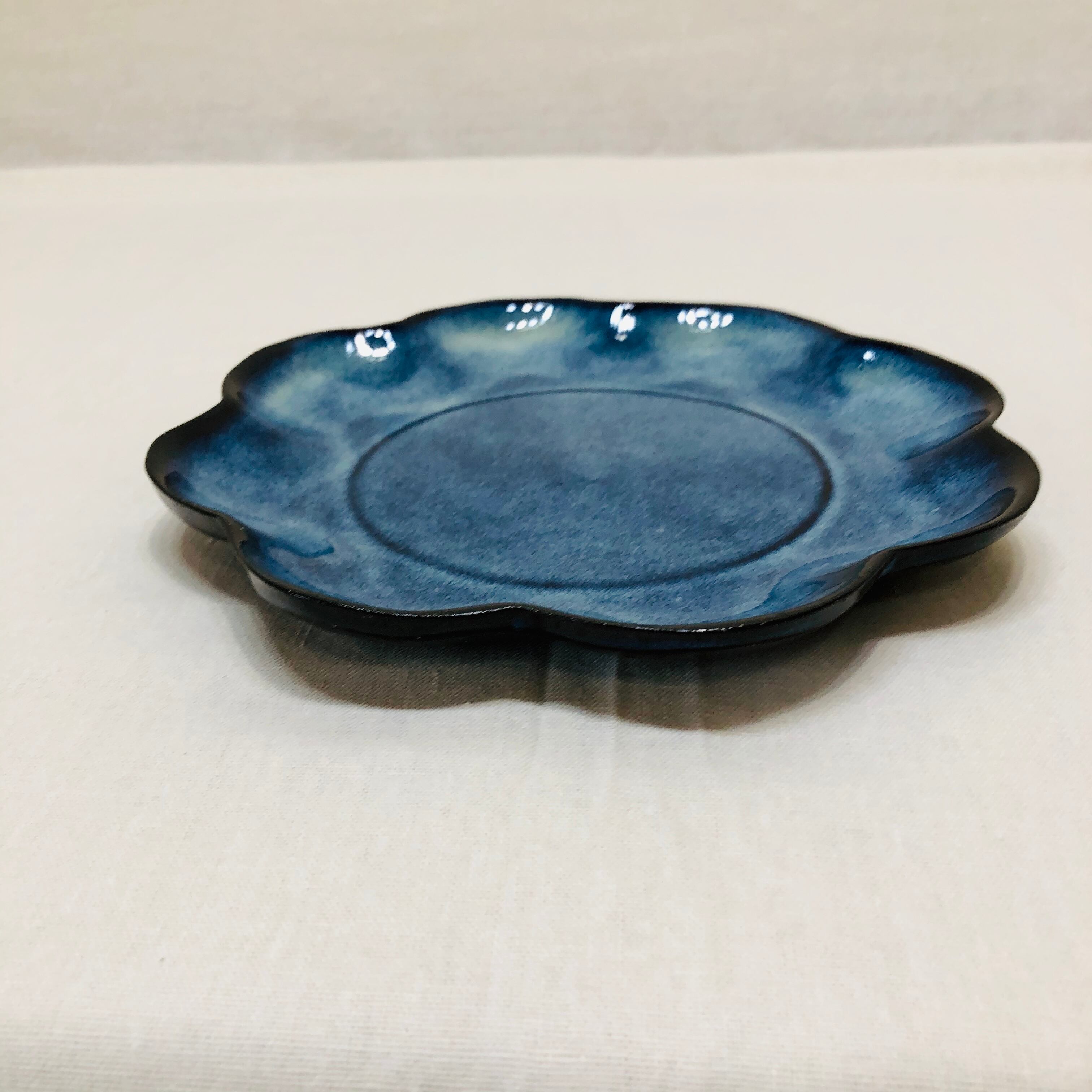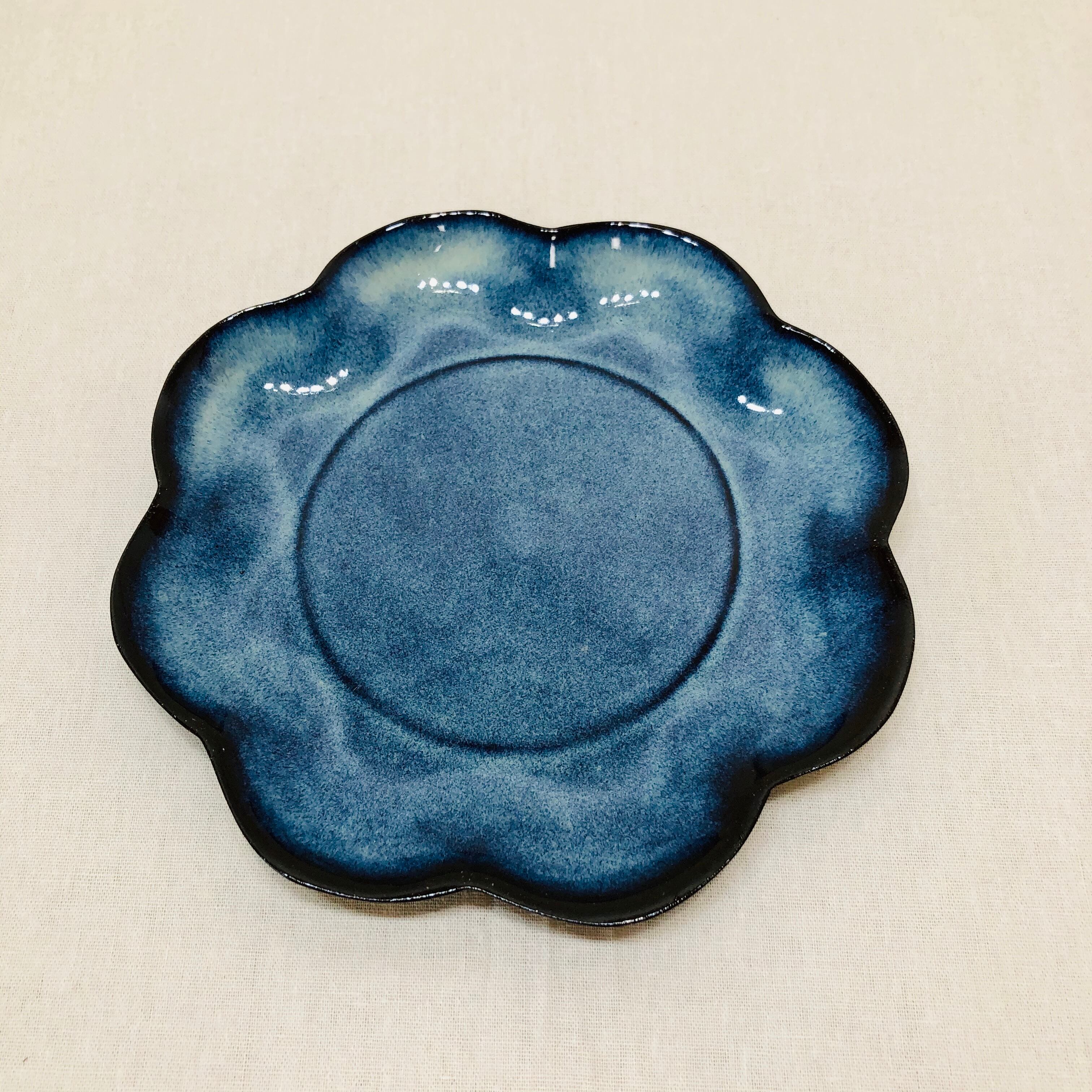 鉄分の多い土で作品を作り、天然の藁灰、木灰を調合した釉薬を使用している為、青く発色した釉薬の流れが不安定で同じ物はできません。